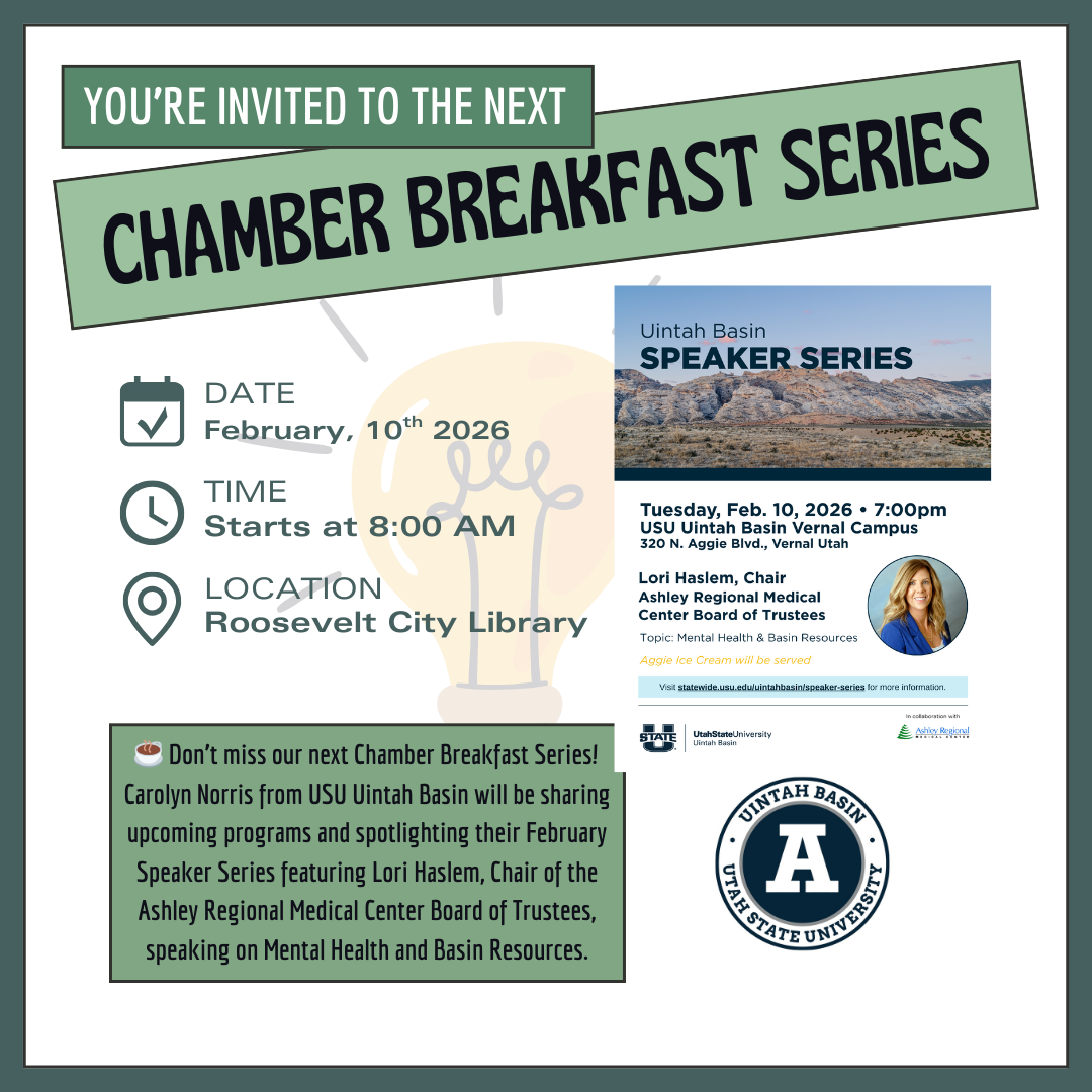 The Chamber of Commerce Serving Duchesne County is a non-profit organization dedicated to fostering economic growth, supporting local businesses, and enhancing the quality of life in our community. Located in the heart of Utah's Uintah Basin, we serve as a vital resource for businesses of all sizes, providing networking opportunities, advocacy, and tools for success. Our mission is to serve, strengthen, and promote economic vitality, working hand-in-hand with community leaders, residents, and entrepreneurs to create a thriving and prosperous future for Duchesne County. Together, we are building a stronger community, one connection at a time.